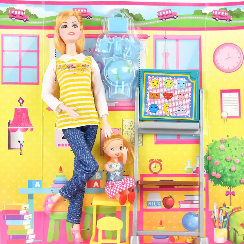 Para las amantes de las muñecas, está opción es hermosa. Barbie profesora incluye, tablero con dos opciones de dibujo, silla para la estudiante, estudiante y otros elementos escolares.