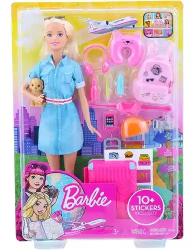 Barbie es una viajera por naturaleza y fiel amiga de su cachorrito, es por eso que en esta oportunidad ha empacado todo lo necesario para aventurar y explorar alrededor del mundo ¿La acompañarás? Incluye una maleta rosa que se abre y cierra de verdad y una hoja con stickers, que puede ser usada para decorar la maleta y para documentar sus viajes. Su maleta está llena de las necesidades de viaje como un celular, una almohada para cuello, audífonos, cepillo y pasta de dientes y una cámara ¡No esperes más y adquiere ya este Set! Recomendado para niñas de 3 años en adelante. Incluye muñeca Barbie, una maleta rosa, una hoja con stickers, un celular, una almohada para cuello, audífonos, cepillo y pasta de dientes y una cámara.