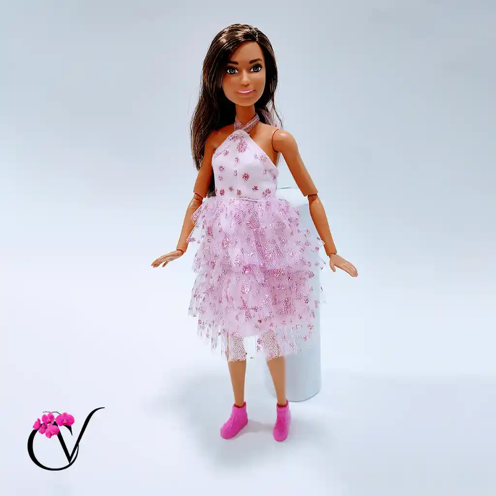 Diseñado para: Barbie estándar Material: Vestido en tull escarchado con cierre de velcro .⚠️¡Fabricamos solo uno!, no vas a encontrar uno igual a este hermoso vestido¡Único y especial! igual que tú 💜⚠️ 📍La muñeca no se vende 📍Los accesorios no se venden 💡Recuerda que si quieres mas detalles nos puedes escribir por cualquier canal o a nuestro WhatsApp 313 2511730 😉, estamos para servirte. #ApoyaLoColombiano 💛💛💙❤️