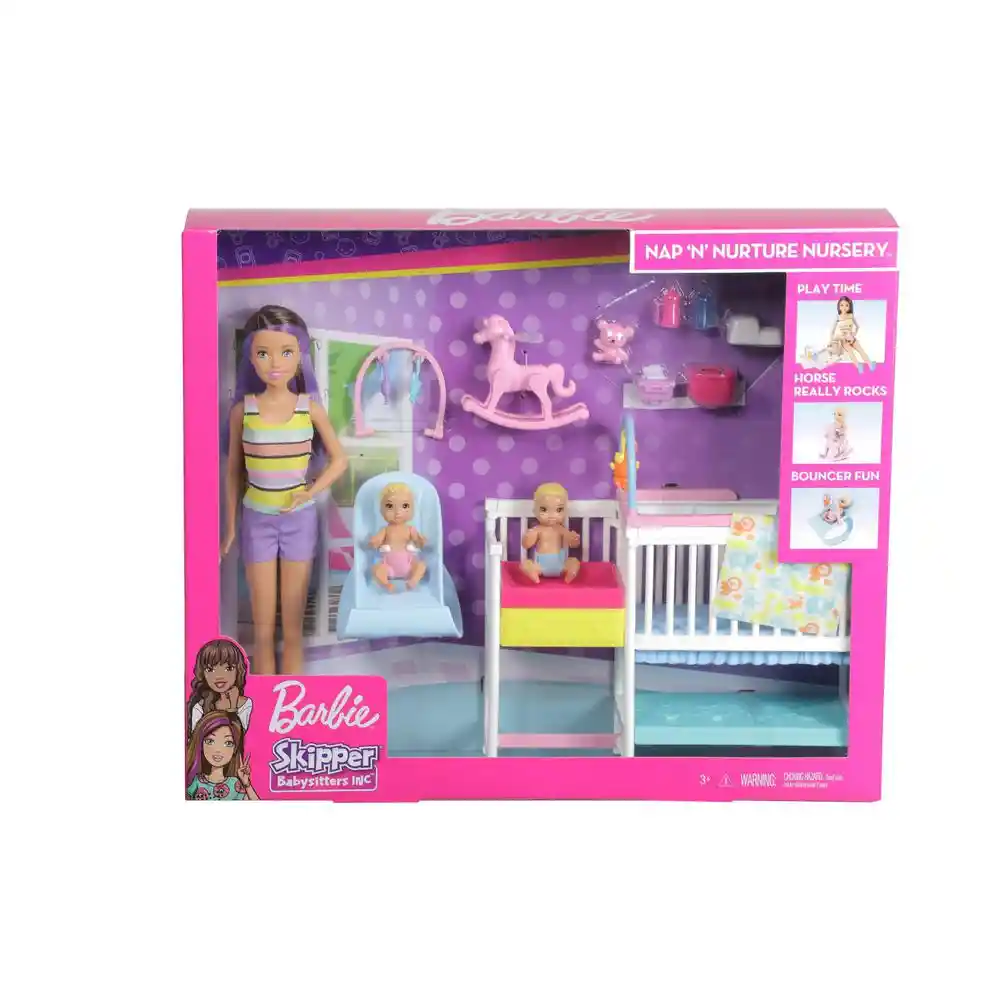 Set Barbie Contiene 15 Unidades. Las Muñecas y Los Juguetes Barbie Skipper Babysitters Inc. Permiten Que Las Niñas Exploren su Lado Cariñoso Como Niñeras. El Juego Nap 'n' Nurture Nursery de la Muñeca Skipper Estimula la Imaginación Para Que se Haga Cargo y Ayuda a la Muñeca Skipper a Cuidar de Dos Adorables Muñecos Bebés. Añade Diversión Para Contar Historias! Un Diseño Plug-And-Play Mantiene Algunas de Las Piezas Más Pequeñas en su Lugar Para la Acción de Cuidar Niños y Facilitar la Limpieza. Los Niños Pueden Jugar a Alimentar Cambiar y Entretener Con Las Muñecas Gemelas Usando Artículos Para Bebés de Juguete Inspirados en Los Artículos Clásicos de Fisher-Price.