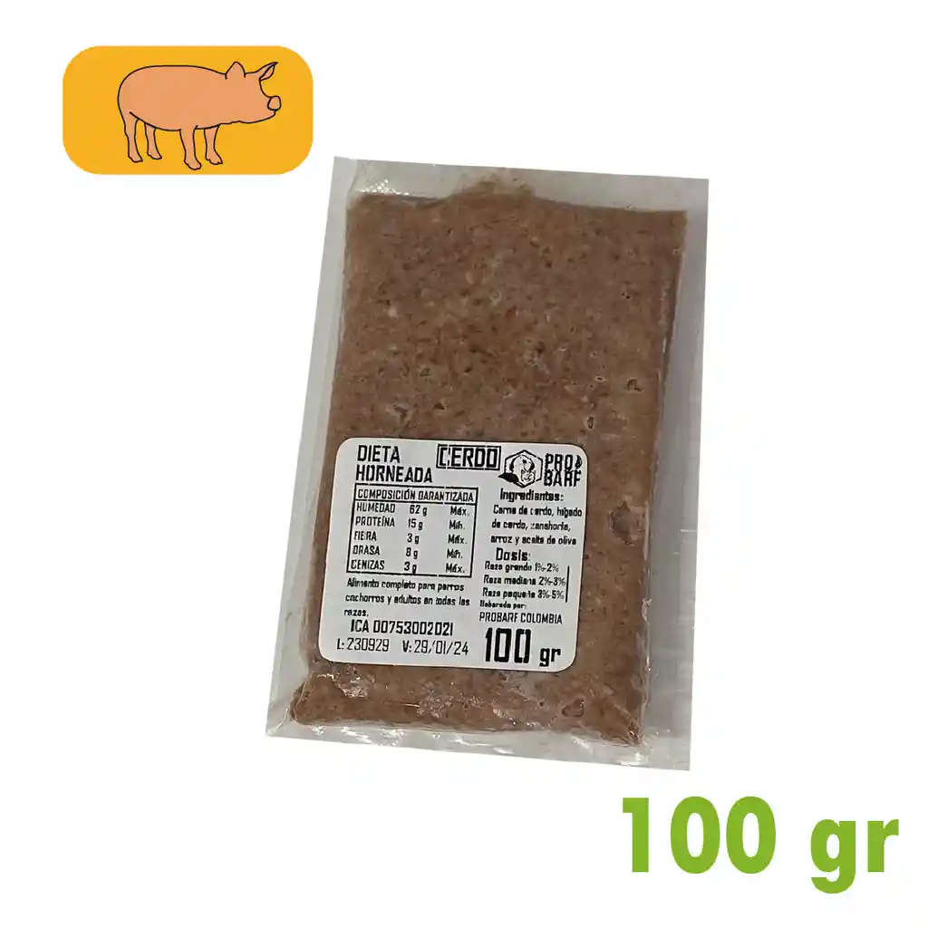 Unidad de BARF Horneada x 100 Gramos, sabor Cerdo **Este producto debe permanecer congelado y solo descongelar la porción que vaya a utilizar en el momento.**