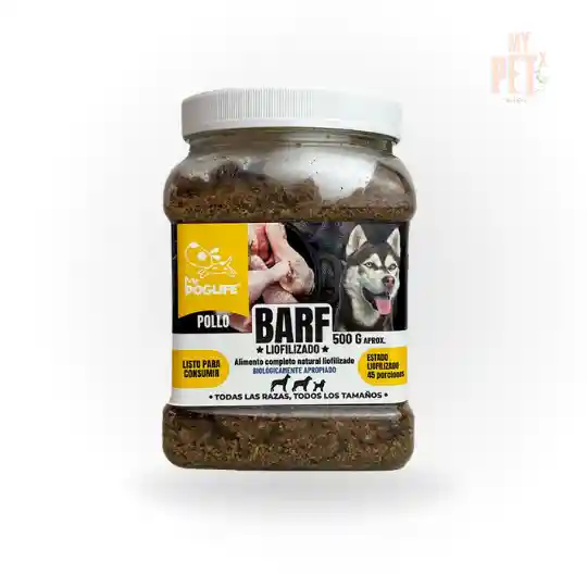 Alimento BARF liofilizado en polvo de pollo para perros, 100 % natural, sin conservantes y apto para todas las razas y edades desde los 2 meses. Ideal para quienes buscan una nutrición completa, práctica y saludable. No necesita refrigeración y su proceso de liofilización preserva todos los nutrientes, garantizando una alimentación segura y balanceada
