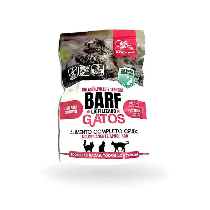 Alimento BARF liofilizado para gatos 100% natural, ideal para todas las razas y tamaños a partir del destete. Gracias a su proceso de liofilización conserva sabor, olor y nutrientes sin necesidad de refrigeración ni conservantes.