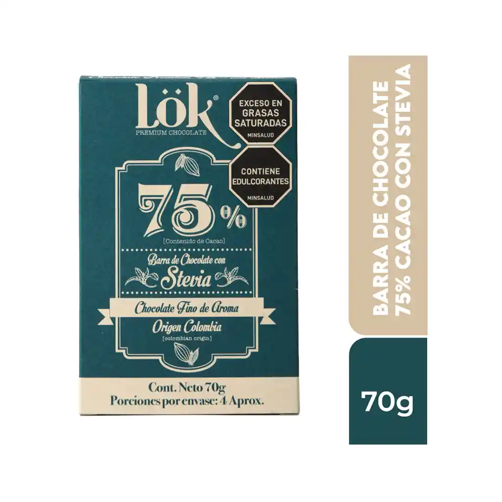 Disfruta el balance ideal entre la dulzura natural y la intensidad del cacao fino con nuestra Barra de Chocolate Lök 75% Cacao endulzada con Stevia. Su sabor redondo y aromático la convierte en la elección perfecta para quienes buscan un chocolate sin azúcar refinada y naturalmente libre de gluten. Ideal para acompañar un buen café, maridar con vino tinto o disfrutar con frutos secos.