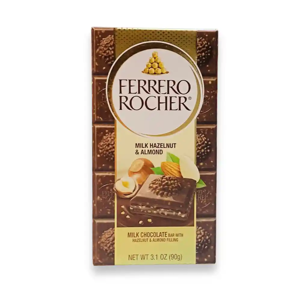Ferrero Rocher Milk Hazelnut & Almond 90 g – Tableta de Chocolate con Leche, Avellanas y Almendras Disfruta el refinado sabor de la Barra de Chocolate Ferrero Rocher Milk Hazelnut & Almond, una combinación irresistible de chocolate con leche, trozos de avellana y almendra tostada, con un relleno cremoso que resalta la elegancia y calidad que caracterizan a Ferrero. Sabor y textura inconfundibles Cada porción ofrece una experiencia sensorial única: una capa de chocolate con leche suave y equilibrada, con notas de cacao y frutos secos. El interior cremoso de avellana y almendra brinda un contraste perfecto entre dulzura, crocancia y suavidad, ideal para los amantes del chocolate gourmet. Características principales Contenido: 90 g. Tipo: Tableta de chocolate con leche, relleno de avellanas y almendras. Textura: Crujiente por fuera, cremosa por dentro. Marca: Ferrero Rocher. Origen: Italia. Presentación: Barra dorada elegante, ideal para regalar o disfrutar como detalle sofisticado. Beneficios y experiencia de consumo Elaborada con avellanas y almendras seleccionadas de alta calidad. Aporta un sabor balanceado entre cacao, leche y frutos secos. Ideal para acompañar café, postres o momentos de indulgencia. Recomendaciones de uso Conservar en un lugar fresco y seco (18 °C a 22 °C). Evitar exposición directa al calor o la luz solar. Perfecta para regalar, compartir o disfrutar como snack premium. Advertencias Contiene leche, avellanas, almendras y soya. Puede contener otros frutos secos. No apto para personas alérgicas a frutos secos o lácteos.