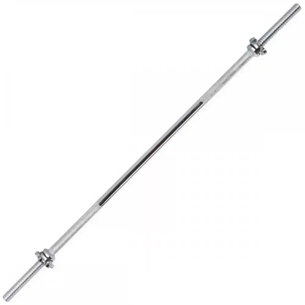 Barra recta en acero cromado con agarre antideslizante. 2 seguros roscados. Para discos estandar. Peso: 5 Kg con los seguros roscados.150 cm(largo) x 2.5 de DiámetroPara Discos estándar.