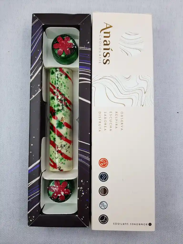 La barra de chocolate viene rellena de ganache de sal marina, con un toque de pimienta. Los bombones redondos decorados con flores de navidad, están rellenos de ganache de mandarina.