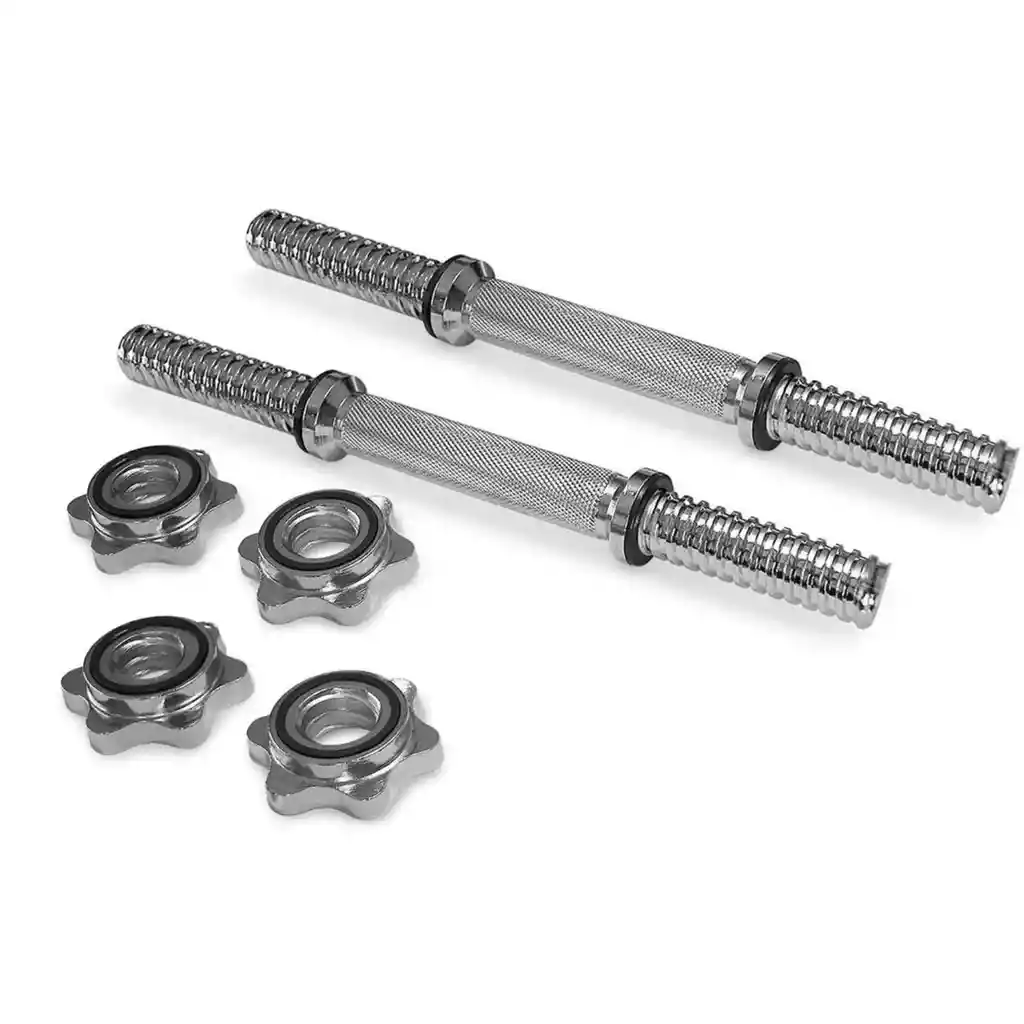 Cada barra Tiene un peso neto de 2kg. Viene con 2 seguros roscados que ofrecen máxima seguridad en el entrenamiento. Dimensiones: 7 (alto) x 3 (ancho) x 36 (largo) 2 Barras en acero cromado con agarre antideslizante. 2 seguros roscados para discos estándar. Cada barra con sus 2 seguros roscados pesa 2 Kg. Agarres esmerilados. Excelente calidad, 100% garantizada.