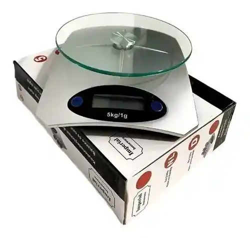 BASCULA ref KE-5 Con pantalla digital, superficie en vidrio. Pesa 5kg/1g color gris Dimensiones del producto alto 4,5 cm ancho 14 cm fondo 19 cm dimensiones del vidrio 15 cm medidas del empaque 16 x 21,5 x 6 cm