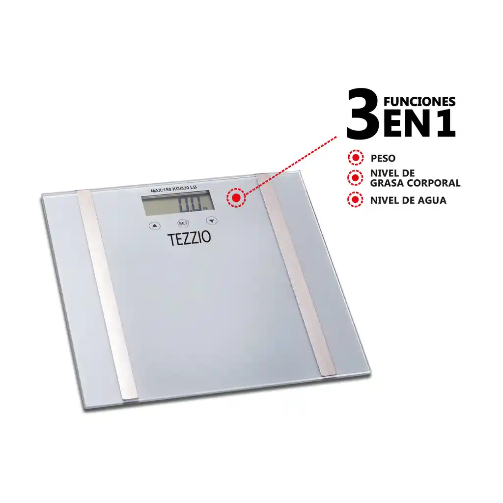 • Índice de marca corporal BMI. • Grasa corporal. • Nivel de agua. • Permite crear y almacenar hasta 10 perfiles de diferentes usuarios. • Capacidad: 2.5 - 150 Kg. • Graduación: 100 gr. • Uso doméstico. • Indica de forma independiente el porcentaje de agua y grasa corporal. • Pantalla LCD de visualización de 73*29 mm. • Base de cristal de seguridad de 5 mm. • Tamaño de la báscula: 280*280*20 mm. • Interruptor de encendido. • Función de auto apagado. • Función de selección de medida. • Kilogramo. • Libra. • Indicador de sobrepeso o batería agotada • Requiere batería 2 baterías AAA.