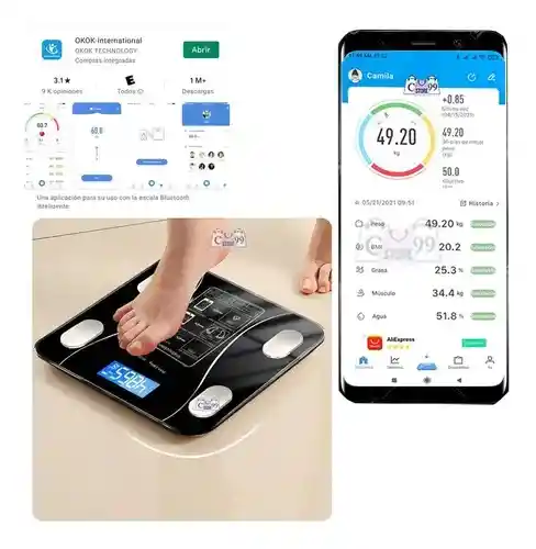 Podrás hacer seguimiento de tu peso y el de 7 usuarios más, con conexión bluetooth a smartphone para enlazar con la aplicación “TOKOK” Además de medir, permite conservar históricos de :Peso, Índice de masa corporal (IMC), Porcentaje de grasa corporal, Índice de masa muscular, Porcentaje de agua corporal, Grasa visceral Densidad óseaTasa de metabolismo basal. Por medio de los históricos, la aplicación grafica el cambio de dichos índices a través del tiempo. Resiste de 5Kg hasta 180Kg. Utiliza baterías AAA (incluidas) Utiliza Bluethooth superior a 4.0 APP: OKOK-Internacional