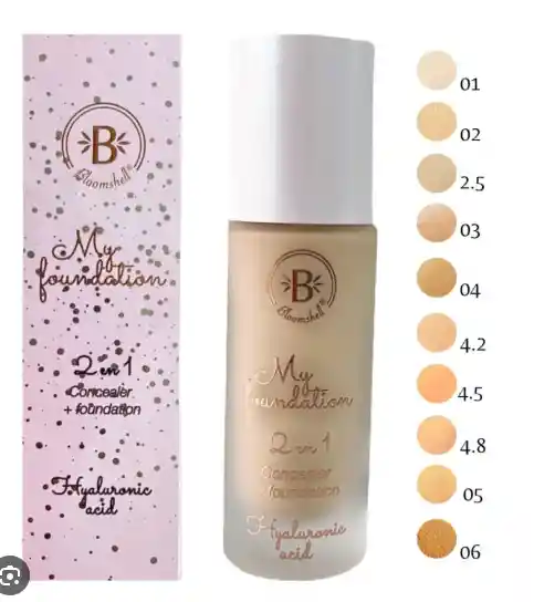 La base de maquillaje My Foundation de la marca Bloomshell tiene una textura ligera y cobertura natural media a completa. Se difumina y se finde en tu piel. Úsala tambien como corrector, gracias a su increíble cobertura. Acabado semi mate, contiene ácido hialuronico por lo que la hace hidratante, dando un efecto natural.