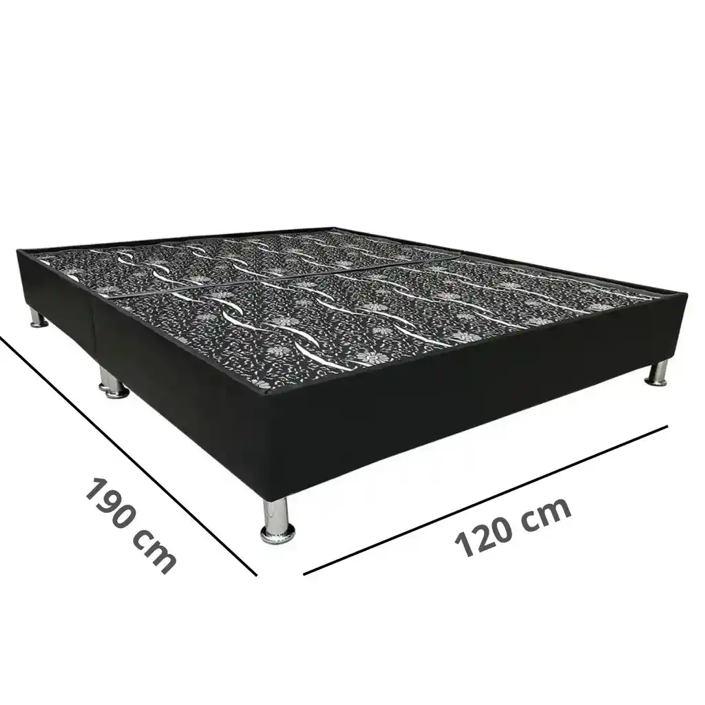 Base cama semidoble dividida Importante: El patrón y color de la tela superior puede variar según la disponibilidad. Medida: 120 x 190 cm Ancho: 120 cm Largo: 190 cm Altura total: 30 cm / Madera: 20 cm - altura de las patas: 10 cm Tamaño de la cama: semidoble Características: - Estructura de 20 cm de altura fabricada en madera inmunizada - Pata plástica negra de 10 cm - Tapizada en tela sencilla negra, fácil de limpiar. (Si deseas otro color puedes contactarnos y te la fabricamos) - Dividida, ofrece una mayor resistencia ya que en vez de 4 patas posee 8, aportando solidez , durabilidad y firmeza, facilidad para transportar y mover.
