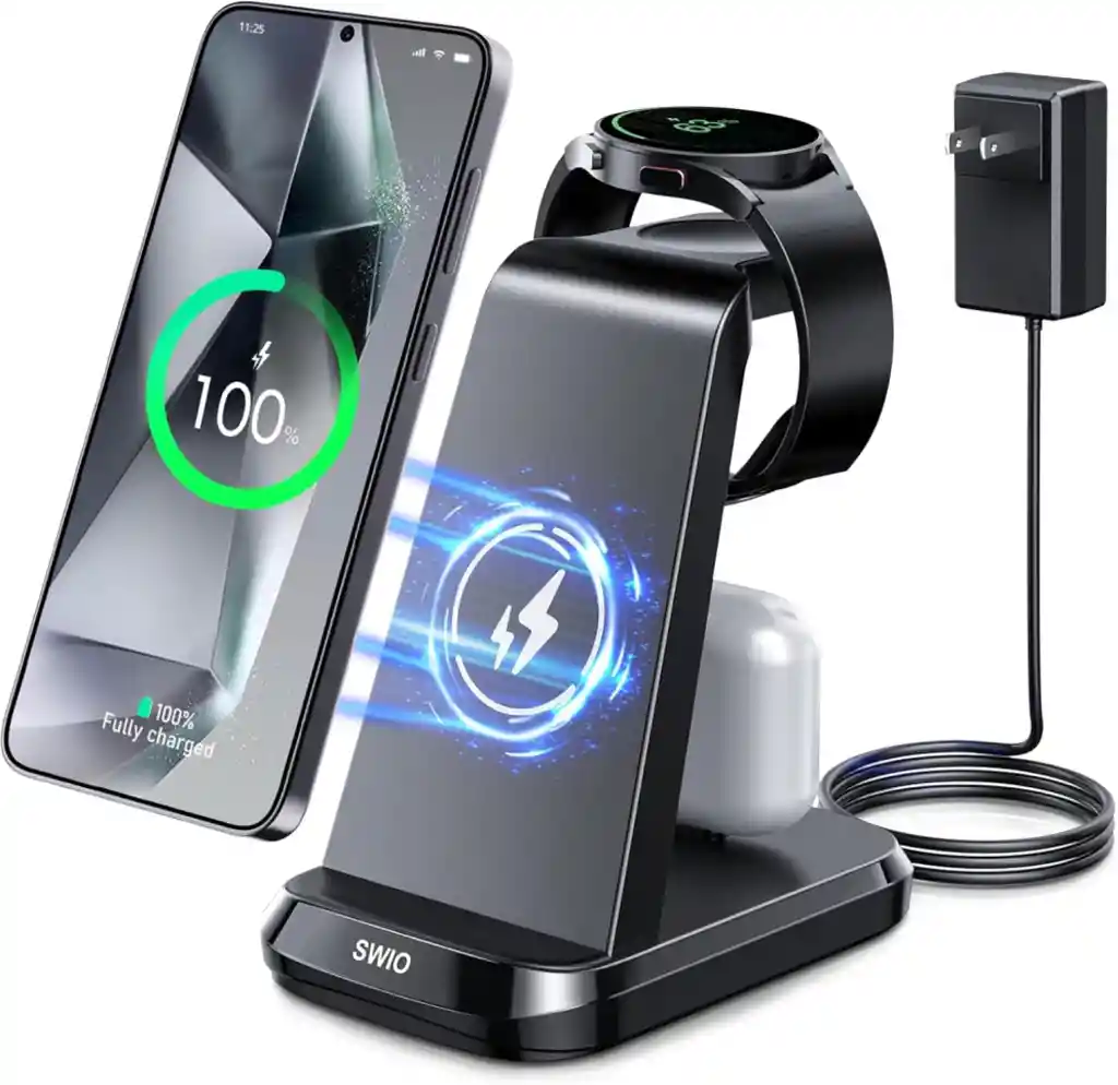 【Gran compatibilidad】Fácil de usar y quitar y quitar. La estación de carga inalámbrica SWIO es compatible con Samsung S24/S24+/S24 Ultra/S23/S23+/S23 Ultra/S22 S21 S20 Ultra/Note 20 10 y Galaxy Watch 7/Ultra/6/6 Classic/5/5 Pro/4/4 Classic/3/Active 2/Active, Galaxy Buds/Buds Pro/Live con USB-C. Cargador inalámbrico 3 en 1: diseñado específicamente para usuarios de Samsung, la estación de carga inalámbrica SWIO 3 en 1 puede cargar simultáneamente tu teléfono Samsung, Galaxy Watch y auriculares al mismo tiempo. Reduce el desorden de cables y mantiene tu escritorio organizado. La tecnología de carga inalámbrica hace que el proceso de carga sea más fácil y cómodo.