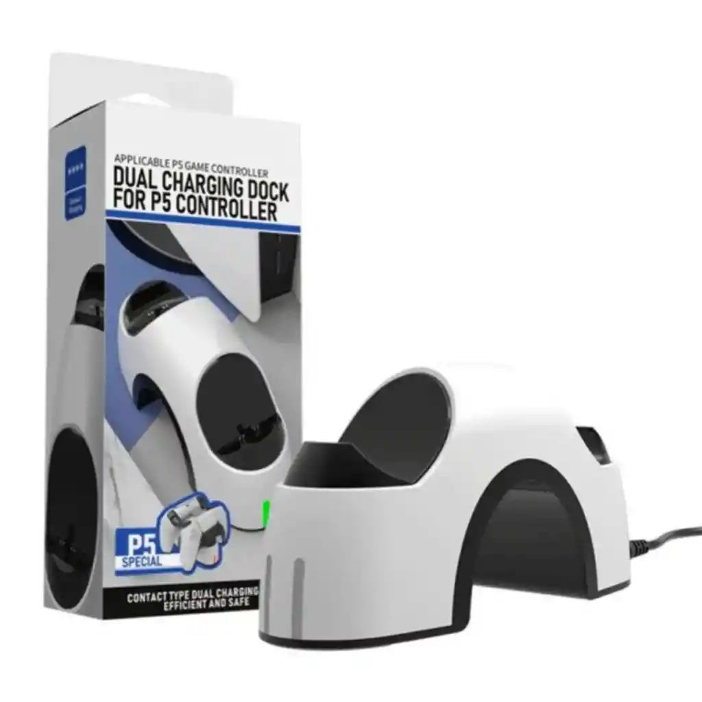 Base de Carga Dual para Controles PS5 – Compatible con Mandos DualSense Mantén tus controles PS5 siempre listos para jugar con esta base de carga dual diseñada especialmente para mandos inalámbricos DualSense. Gracias a su diseño compacto, eficiente y fácil de usar, cargar tus controles nunca fue tan cómodo y seguro. Características destacadas: Carga simultánea para 2 controles: permite cargar dos mandos PS5 al mismo tiempo sin ocupar puertos USB de la consola. Diseño exclusivo para DualSense: encaje perfecto y seguro con los controles originales de PlayStation 5. Conexión mediante pines de contacto o USB-C: sin forzar los puertos del control, prolongando su vida útil. Indicador LED de estado de carga: muestra de forma visual cuándo los mandos están cargando (luz roja) o completamente cargados (luz azul o verde, según modelo). Protección múltiple: sistema de seguridad integrado contra sobrecarga, sobrecalentamiento y cortocircuito. Diseño moderno y compacto: ideal para mantener tu espacio gamer organizado y estético.