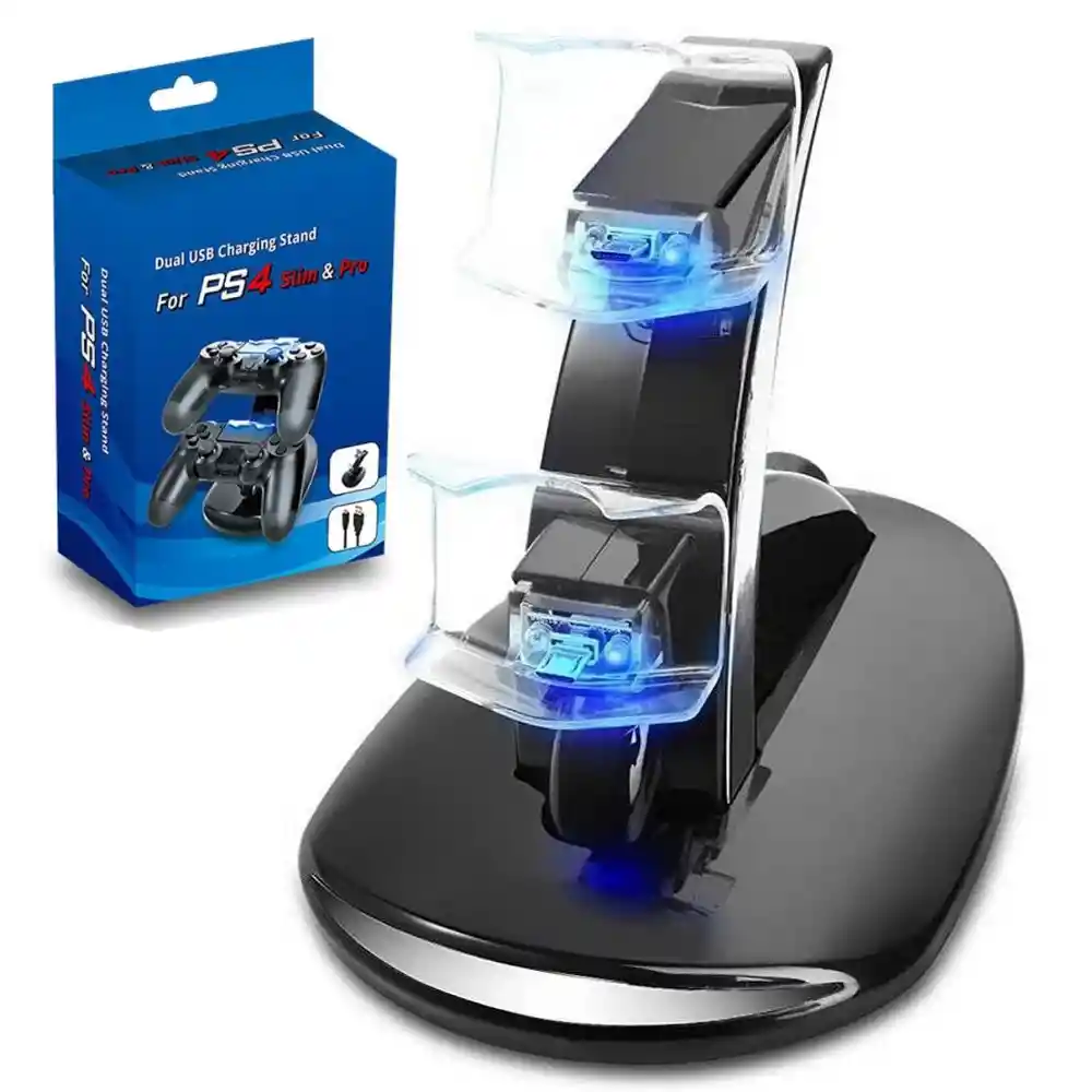 PS4 Controller Cargador de estación de carga, Dualshock Docking Charger Stand con cable USB y LED para Sony Playstation 4 / PS4 Slim / PS4 Pro Soporte de carga Dualshock: Le permite almacenar y cargar de forma segura dos controladores de PS4 al mismo tiempo en 2,5 a 4 horas. El soporte tiene 2 ranuras micro USB. Simplemente conecte sus controladores en los conectores apropiados y la carga puede comenzar. Conveniente y portátil: Alimentado por el puerto USB de la consola PS4, una PC o una toma de corriente. No solo se limita al sistema PS4, lo que le permite cargar sus controladores en cualquier momento y en cualquier lugar. Ahorro de espacio y seguridad: No solo una estación de carga, sino también ideal como soporte para mantener sus controladores bien organizados en lugar de dejarlos en todas partes. Con protección contra sobrecarga/sobrecalentamiento/sobrecorriente/sobretensión/cortocircuito. Bonito indicador de luz LED: La luz parpadea cuando se carga. Una vez que deja de parpadear, la carga está completa. La luz es suave y no molesta por la noche. Especificaciones Material: plástico ABS y PC Entrada: CC 5V 1000mA Salida: CC 5V 500-1000mA Longitud del cable: 50cm Tiempo de carga: 2-4 horas Tamaño: 6,06 x 4,41 x 6,3 pulgadas (largo x ancho x alto). Peso: 0,29 libras. Lo que obtienes con tu compra: 1 x Base 1 x Cable de carga USB