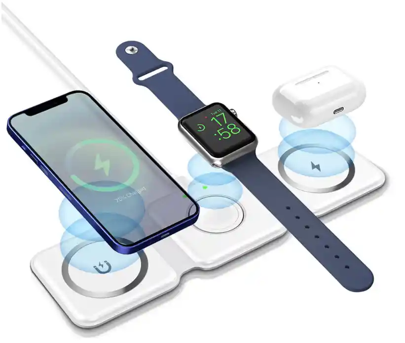 Base de carga inalámbrica MagSafe para iPhone, cargador inalámbrico plegable, duradero y de primera calidad. El diseño innovador le permite cargar sus dispositivos Apple en múltiples orientaciones, lo que los convierte en los cargadores inalámbricos de viaje 3 en 1. Admite carga con Apple Watch, iPhone 12 en adelante con Magsafe, iPhone 8 en adelante así como dispositivos que soporten carga inalámbrica. *Nuestros productos cuentan con garantía la cual se explica en la factura de venta envía con la orden.