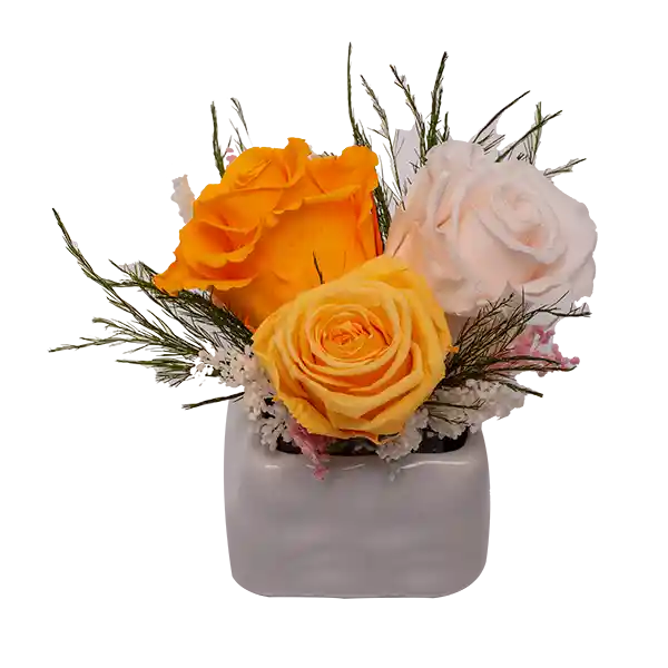 Base Cerámica Con Ondas Con 3 Rosa Natural Preservadas Estándar Amarillo- Blanco. Tamaño 8 x 10 cm