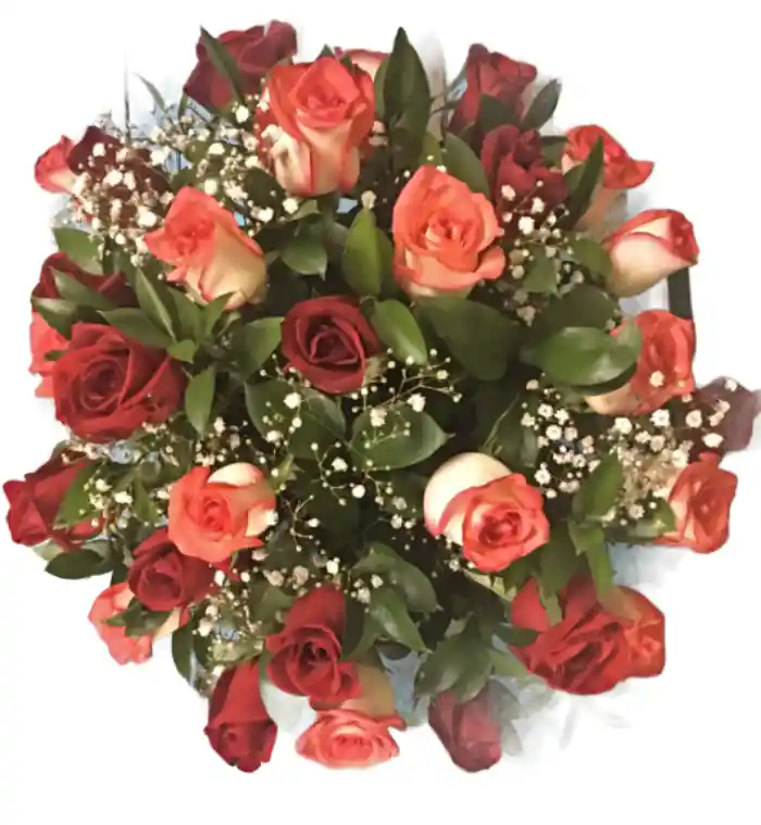 Balde con 30 rosas, follajes y tarjeta. El color del balde y la flor será según disponibilidad en tienda.