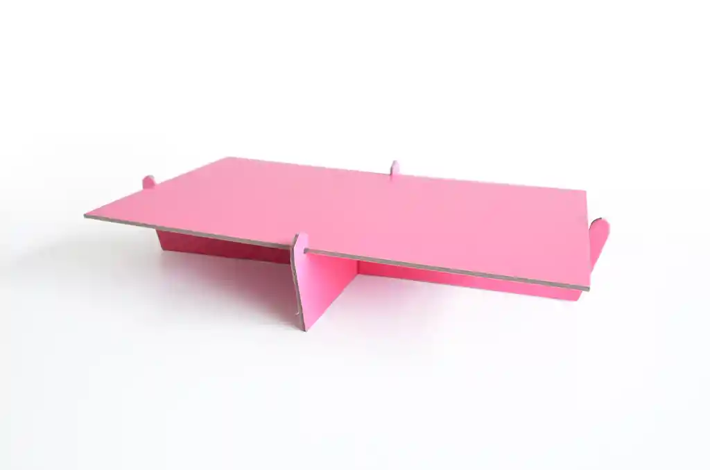 Bandeja o altura para postres color rosado, 27x17x5 cm en cartón de alta resistencia, desarmable, no absorbe la humedad.