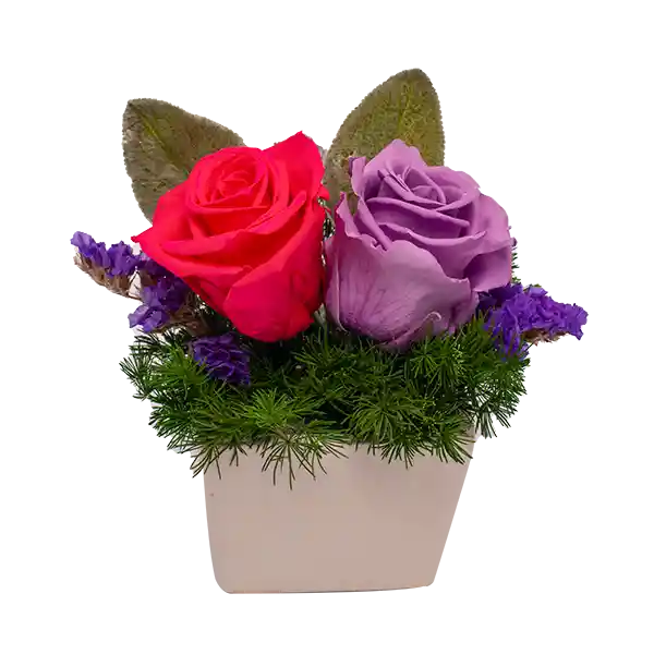 Base Ceramica Cuadrada Blanca Con 2 Rosas Fucsia y Lavanda Natural Estandar Preservada. Tamaño 8 x 9 cm