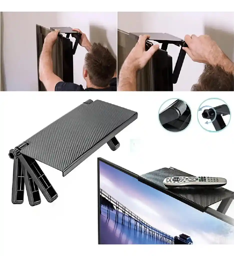Estante de TV ajustable, estante superior, estante de exhibición, monitor de computadora, soporte de escritorio vertical. CARACTERISTICAS: •Material ABS respetuoso con el medio ambiente, seguro y saludable, resistencia a altas temperaturas, sin deformación, resistente y duradero. •Diseño creativo para maximizar la utilización del espacio. •Completamente nuevo y de alta calidad. •Deje que el escritorio desordenado luzca nuevo y dé un buen humor al trabajo. •Peso: aproximadamente 500g •Material: ABS •Color: Negro •Punto de venta: creatividad, uso del espacio, materiales de calidad. QUE INCLUYE: •1 Base Estante Soporte Plegable Para Pantalla Tv & Computador