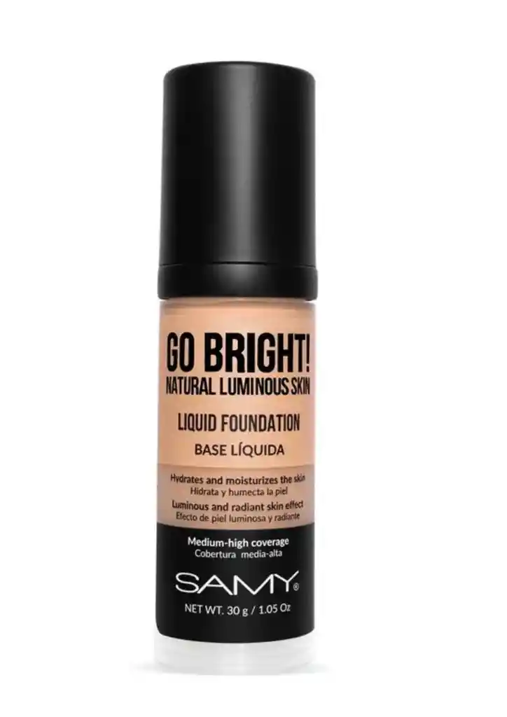 Nueva BASE LÍQUIDA GO BRIGHT! con una novedosa formulación, de cobertura media-alta que se deja construir y adecuada para todos los tipos de piel, apta para aquellas personas que buscan hidratar y humectar la piel, logrando un acabado natural, no acartonado, resaltando la luminosidad natural de la piel Modo de uso Aplicar sobre el rostro y difuminar con una brocha o una esponja de maquillaje. RECOMENDACIONES DE USO: Uso exclusivamente externo. Evite el contacto con los ojos. Si se produce irritación suspenda su uso y consulte a su médico. Manténgase en un lugar fresco y seco, alejado de los rayos del sol y del alcance de los niños. 2 Base Líquida Go Bright! Samy Nueva BASE LÍQUIDA GO BRIGHT! con una novedosa formulación, de cobertura media-alta que se deja construir y adecuada para todos los tipos de piel, apta para aquellas personas que buscan hidratar y humectar la piel, logrando un acabado natural, no acartonado, resaltando la luminosidad natural de la piel. Colores: 5.0 TAN Contenido Modo de uso Beneficios Maquillaje fluido de textura ligera que unifica el tono de la piel. Proporciona un acabado perfecto y natural a la vez. Sus componentes aportan hidratación y humectación a la piel, adicionalmente sus pigmentos aportan luminosidad en el rostro. Running Shopping, Somos especialistas en Belleza ; productos 100% Originales , garantizados y entregas rapidas !