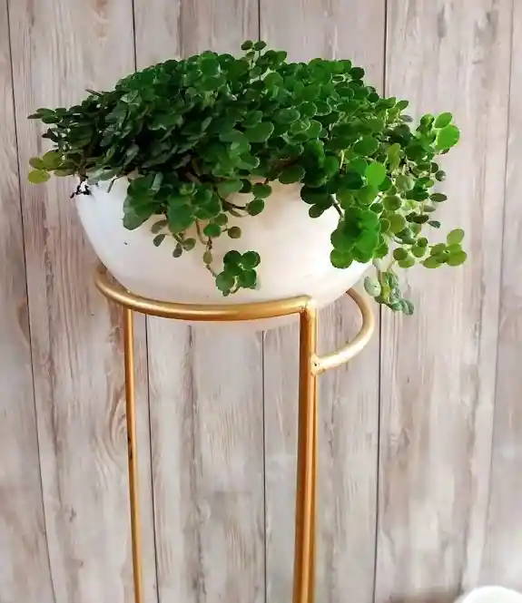 Base metalica dorada de 70 cms de alto, matera elaborada en concreto color blanco de 26 cms de diametro, planta natural enredadera colgante. El color presentado en la fotografía es una aproximación al color real. Revisar el producto al momento de la entrega, no se aceptan devoluciones posterior a la entrega.