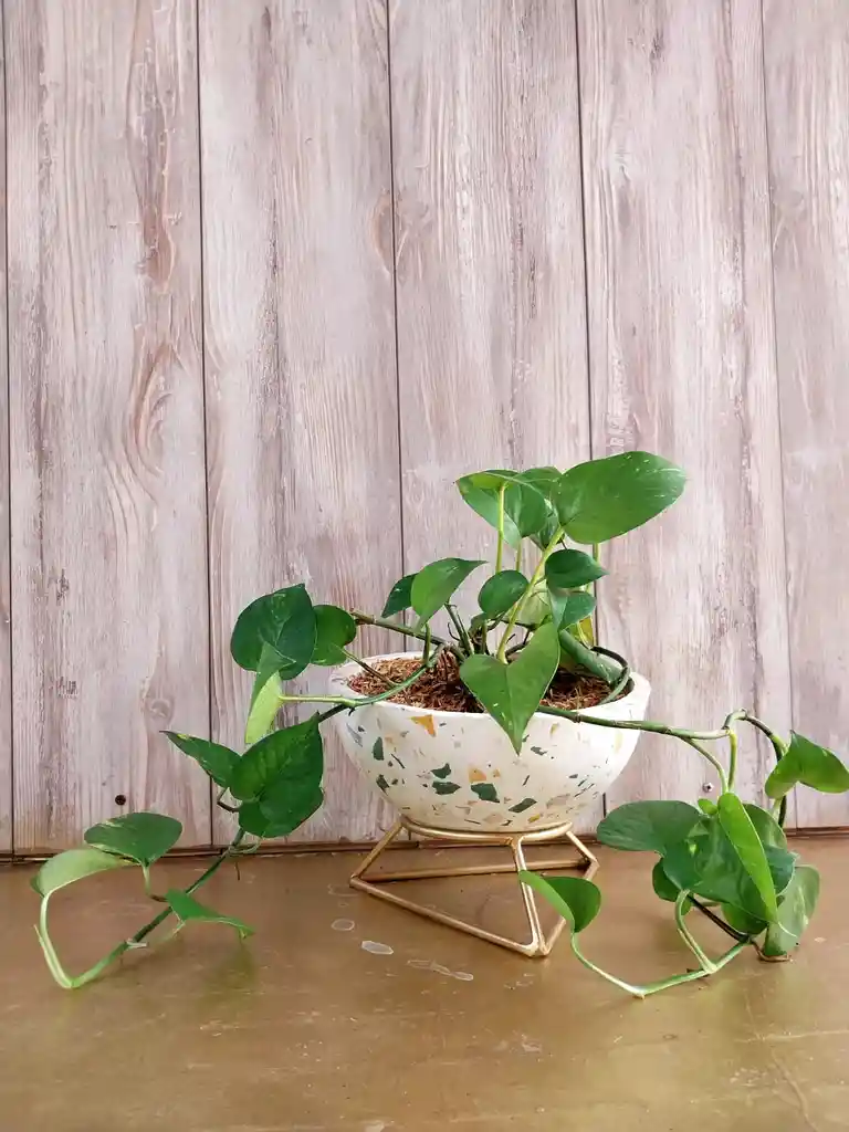 Base metalica dorada de5 cms de alto, matera elaborada en material terrazo color natural de 23 cms de diametro, planta natural photos, el color presentado en la fotografía es una aproximación al color real. Revisar el producto al momento de la entrega, no se aceptan devoluciones posterior a la entrega.