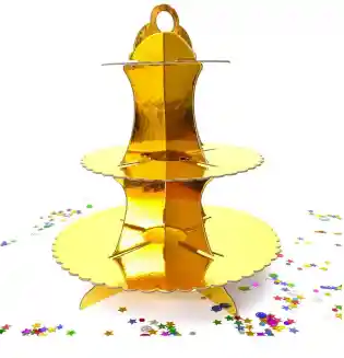 Base para Cupcakes mediana de 3 niveles ideal para colocar en fiestas junto a la mesa de postres. Diponible en colores : Dorado, PlatEspectacular Torre para Cupcakes para decorar las mesas de sus fiestas. Material: Cartón Satinado de alta calidad, fácil de limpiar muy duradero.