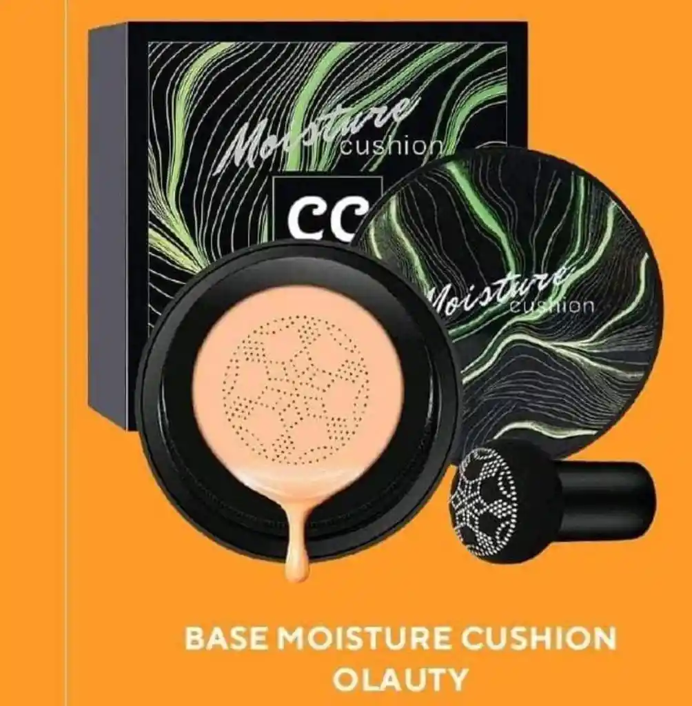 Moisture Cushion CC Cream" de la marca Olauty. Este tipo de base es conocida por su textura ligera y su capacidad para unificar el tono de la piel, cubrir imperfecciones y proporcionar hidratación. Características principales: Textura: Ligera, sedosa y fácil de difuminar. Cobertura: Puede ser ligera o media, ajustable según la cantidad aplicada. Acabado: Natural, luminoso y radiante. Ingredientes: Contiene extractos botánicos y vitaminas para el cuidado de la piel. Aplicación: Se utiliza con una esponja especial que viene incluida en el empaque.