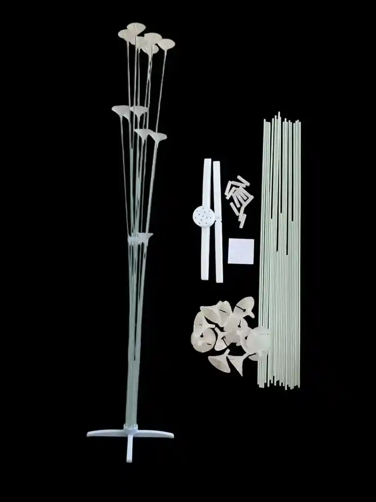🎈 Base resistente con varillas metálicas para mejor postura y durabilidad, con capacidad para 12 globos. Incluye: -2 Pieza para base pequeña en cruz -23 Varillas delgadas -11 uniones para extensión de las varillas para alcanzar la altura completa de la base. -12 Copas pequeñas para globo. -4 Stikers Pequeños Redondos para fijar la base a la superficie donde se vaya a instalar.