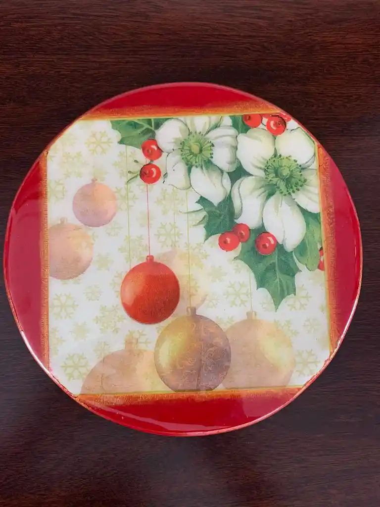 Base en madera resinada pintada a mano con técnica decoupage. Perfecta para tablas de quesos, como porta caliente o decorativa. Medida: 20 cm de diámetro.