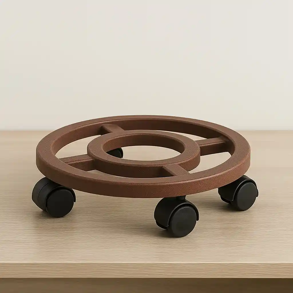 Base plástica compacta y resistente en color café, perfecta para mover materas de tamaño mediano sin esfuerzo. Su estructura circular con soporte interno y 4 rodachines giratorios proporciona estabilidad y facilita el desplazamiento en todo tipo de superficies. Ideal para el hogar, oficinas o terrazas, protegiendo tus pisos y haciendo más fácil la limpieza o reubicación de plantas. Diámetro: 21,5cm