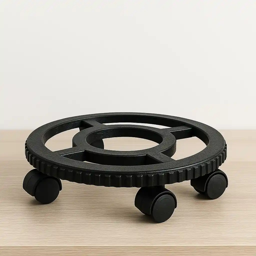 Base plástica robusta de color negro con diseño circular y bordes dentados, ideal para mover materas grandes de forma segura y sin esfuerzo. Equipada con 4 rodachines resistentes que giran suavemente en múltiples direcciones, esta base es perfecta para facilitar la limpieza y reorganización de espacios en interiores y exteriores. Su diseño elegante en negro combina con cualquier decoración y brinda estabilidad a tus plantas. Diámetro: 31,5 cm