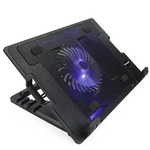 Base Refrigerante Para Portátil 5 Niveles 1 Ventilador ** Base refrigerante de 1 ventiladores ** Cuenta con dos puertos USB permiten conectar más dispositivos USB. ** Tecnología antideslizante única para garantizar el uso seguro de los portátiles. ** Con 5 ángulos ajustables, juega o mira películas en el ángulo más cómodo. ** Con luces azules frías. ** Especial para trabajo 24 horas - Proeje tu laptop - Proteje tu xbox