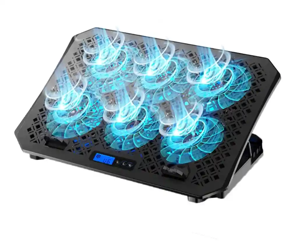 Base refrigeración para laptop con 6 ventiladores de refrigeración con luces azules pantalla LCD 2 puertos USB DETALLES: Súper ventiladores de refrigeración para laptop las almohadillas de refrigeración AICHESON para laptop están especialmente diseñadas con 6 ventiladores de refrigeración 2756 in cada velocidad del ventilador es de 1500 a 2200 RPM desde el nivel 1 hasta el nivel 6 lo que te proporciona flujos de aire ajustables para alargar la vida útil de tu portátil Soportes ergonómicos una vez que el gancho se cae se bloquea en posición y es muy conveniente ajustar los ángulos y alturas los ángulos pueden cambiar de 10 a 27 grados elevando tu laptop de 28 a 52 pulgadas lo que te proporciona una postura mejor y más cómoda cuando se utiliza el portátil