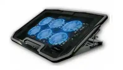 Maya y soporte metálico. 1 ventilador. Doble puerto USB. 5 posiciones. Con ventilador grande de 15cm. Reclinable. Ideal para equipos entre 10 y 16 pulgadas. Ancho: 39cm.