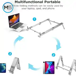 Excelente soporte 3 en 1 compatible con tu laptop. celular o tableta.Diseño 3 en 1: este soporte ajustable para portátil tiene un diseño único con 3 formas de usar. Se adapta a tu ordenador portátil de 15.6 pulgadas. teléfono y tablet. Nota: no tienes que montarlo tú mismo. Solo tienes que sacarlo y usarlo. Sigue las instrucciones del paquete (idioma español no garantizado).Elevador portátil para portátil: aunque el soporte para ordenador portátil está montado en varias barras de aleación de aluminio. también es ligero (0.4 lbs) y portátil. Puedes sostenerlo en tu mano o ponerlo en tu bolsillo. No ocupa demasiado espacio en tu bolso y puedes llevarlo a todas partes.Diseño protector: varias almohadillas de silicona antideslizantes se adhieren al elevador de aluminio para portátil que ayudan a evitar que tu dispositivo y escritorio se rayen. Además. la estructura de varias triángulos ayuda a reforzar los dispositivos de máximo 22.0 lbs y evita que se muevan.Elevador ergonómico para portátil: el soporte para portátil funciona como un elevador para ajustar la altura de la pantalla del portátil a 7 pulgadas y lo lleva a un nivel de ojos perfecto para fijar tu postura. Ayudará a reducir el dolor de cuello y espalda y la tensión ocular para crear espacio adicional y te dará la opción de trabajar sin ningún desorden en tu escritorio.