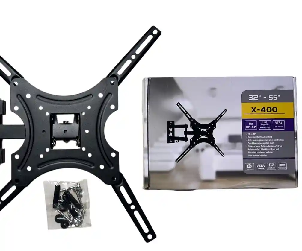 Compatibilidad de TV: Diseñado para televisores de 32 a 55 pulgadas. Capacidad de carga: Soporta un peso máximo de 44 libras (aproximadamente 20 kg). Tipo de soporte: Articulado/brazo extensible. Ajustes: Brazo extensible que permite ajustar la distancia y altura del televisor. Ángulo de inclinación de +8/-5 grados. C ompatibilidad VESA: Compatible con orificios VESA desde 200 x 200 mm hasta 600 x 400 mm.
