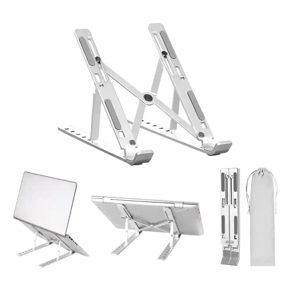 Base Soporte Plegable Ajustable 7 Niveles Portatil Laptop En Aluminio Plateada - Super resistente en aluminio, viene con funda gratis - adecuado para trabajar con tu Computador Portátil o tablet - Ajuste multinivel ( 7 niveles de posicion ) - Medidas: Ancho-16 / Largo-26 / Elevacion-15 cms - Ligero, cómodo, fácil de guardar y cargar - Recomendado para Computadores portatiles de hasta maximo 14" - Te asegura una buena postura frente a su computador - Sirve para todas las marcas y tamaños de portatiles ( Windows y MacOS ) - Tambien para todas las marcas y tipos de tablets y celulares, incluso para poner libros - Color: Gris metal - Puedes trabajar en el mismo soporte, incluso usarlo sobre las piernas. - Plegable: llévalo a todos lados - Gomas protectoras anti-rayones y anti-deslizantes - Auto-ventilación de dispositivos - Soporta Portatiles de hasta 15.6" pero lo recomendamos para 14"