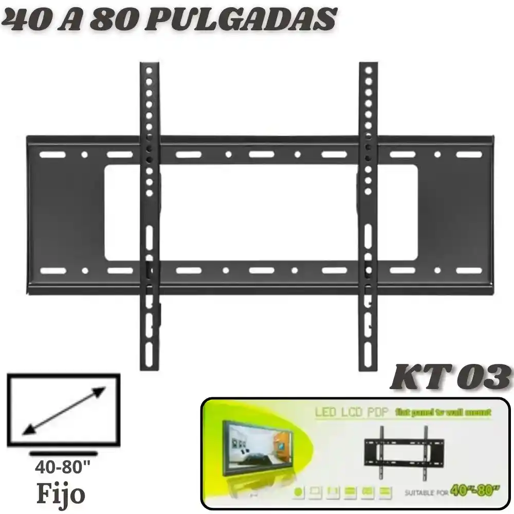 Base Soporte Televisor Ajustable 40 A 80 Pulgadas KT 03 Ahorra espacio y dale a tu hogar u oficina un aspecto moderno y organizado con la Base Soporte KT-03. Este soporte de pared está diseñado para ofrecer la máxima estabilidad y seguridad para televisores de gran formato, desde 40 hasta 80 pulgadas. Características: - Amplia Compatibilidad Universal: Este soporte está diseñado para adaptarse a una gran variedad de marcas y modelos de pantallas planas. Es compatible con televisores LED, LCD y PDP que se encuentren dentro del rango de tamaño de 40 a 80 pulgadas. - Estándar VESA Ajustable: Los rieles verticales cuentan con múltiples orificios de montaje, lo que permite ajustar la altura y adaptarse a diferentes patrones VESA. - Estructura de Alta Seguridad: El modelo KT 03 se caracteriza por ser un soporte tipo "Fijo", ya que cuenta con un nivel de inclinación de (+15° / -15°) Especificaciones: Modelo: KT 03. Tamaños de Pantalla Soportados: De 40" a 80". Tecnologías Compatibles: LED, LCD, PDP. Nota: Las imágenes publicadas son de referencia, el producto real puede presentar ligeras variaciones en su diseño.