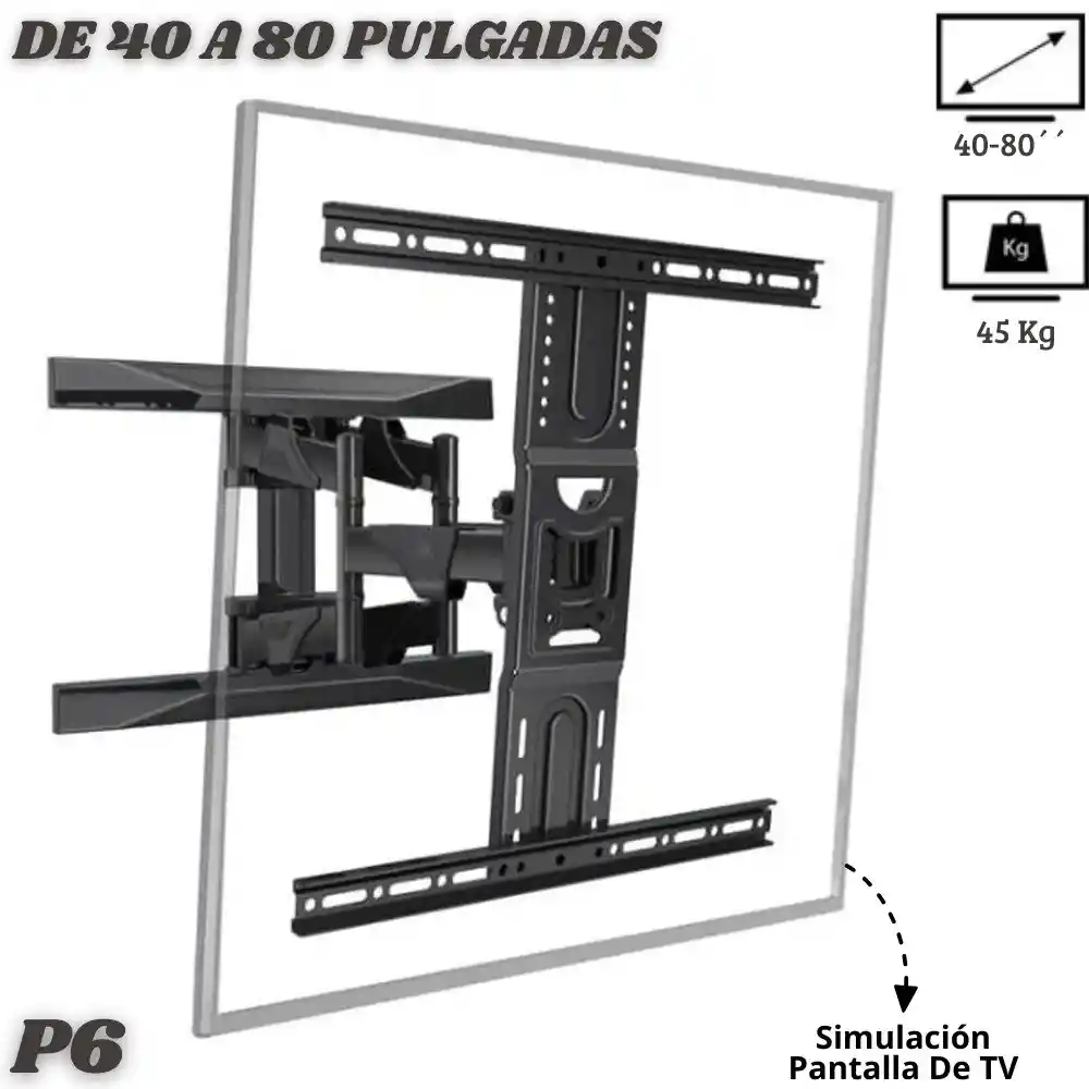 Base Soporte Televisor Ajustable 40 A 80 Pulgadas P6 Es hora de modernizar tu sala, habitación con nuestra Base Soporte Ajustable P6. Esta es la solución perfecta para montar tu televisor de forma segura, elegante y, sobre todo, versátil. Libera espacio, elimina el desorden y coloca tu pantalla exactamente donde la necesitas para obtener el ángulo de visión perfecto. Olvídate de las mesas y muebles voluminosos. Al montar tu TV en la pared, creas una apariencia limpia, moderna y minimalista. - Inclinación (Tilt): Ajústalo verticalmente (+3º /- 5°) para eliminar esos molestos reflejos de la ventana o para encontrar el ángulo perfecto si ves TV desde la cama. - Compatibilidad Universal (40" a 80"): Su diseño versátil se adapta a la gran mayoría de televisores y monitores planos de 40 a 80 pulgadas. Este modelo está fabricado en acero de alta resistencia y está diseñado para soportar firmemente tu televisor (hasta 45 kg MAX), dándote total tranquilidad. Ficha Técnica: - Modelo: P6 - Compatibilidad de Pantalla: De 40 hasta 80 pulgadas. - Capacidad Máx. De Carga: 45 kg - Compatibilidad VESA: Se ajusta a los patrones de huecos 200 * 200 - 600 * 400mm