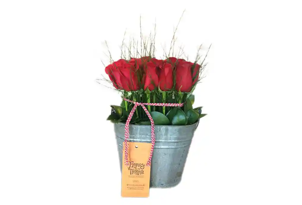 Balde en diferentes motivos con 12 rosas más follaje. El color de la flor sera según disponibilidad en tienda. Medidas aproximadas 25 cms. de alto x 22 cms. de ancho.