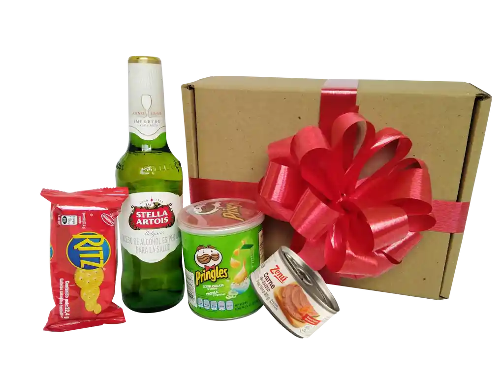 Caja de cartón micro-corrugado 26 x 18Contiene: Cerveza Stella Artois 330ml, Papas Pringles 40g, Carne de diablo Zenu 80g, Galletas Ritz 22.4g.Moño, cinta y tarjeta básica feliz día.