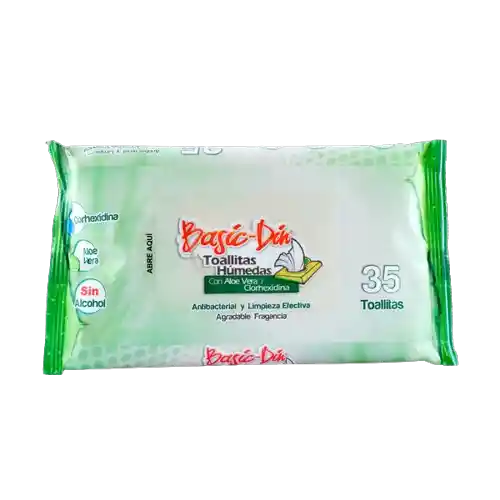 Contiene 35 Unidades. Basic Din Toallitas Húmedas Desodorizantes Limpiadoras y Antisépticas Con Múltiples Beneficios Del Aloe Vera y la Clorhexidina.