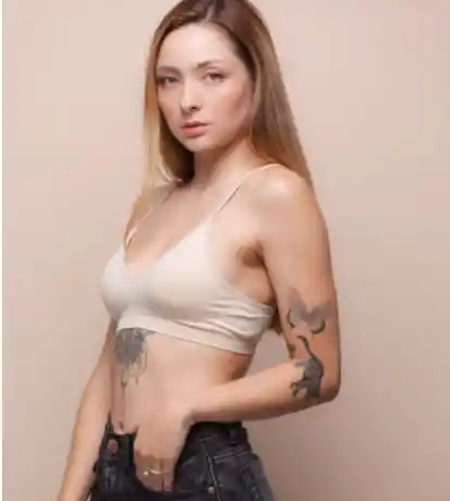 Sujetador deportivo sin costuras con escote en V. tela elástica lisa . cargaderas ajustables. copas removibles y una cantidad perfecta de estiramiento.88% Nylon. 12% SpandexTalla única para: 30 – 32 – 34