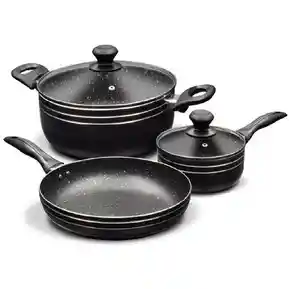 5 piezas Comparte más tiempo con tu familia, su cuerpo en aluminio y anillos de conducción distribuyen más eficientemente el calor permitiendo que la preparación de tus alimentos se realice en menor tiempo. No te preocupes por posibles accidentes, sus accesorios de baquelita aíslan el calor. Su tapa de vidrio cuenta con un regulador de vapor para evitar posibles derrames. Disfruta de este producto por más tiempo , su recubrimiento antiadherente Stone te brinda mayor durabilidad y resistencia. Gracias a su pintura exterior con acabado profesional, lucirá siempre bien en tu cocina. Medidas del producto: Alto: 36 cm Ancho: 30cm Fondo: 12.8cm Características: Olla AA con tapa de 20cm Perol AA con tapa 16cm. Sarten AA 20 sin tapa. Aluminio Antiadherente de alta calidad. 6 Capas de Antiadherente. Mangos y Asas en Baquelita. Tapas de cristal con orificio para dejar salir el calor. Libre de PFOA. Disco Italiano Diseño antiadherente panal