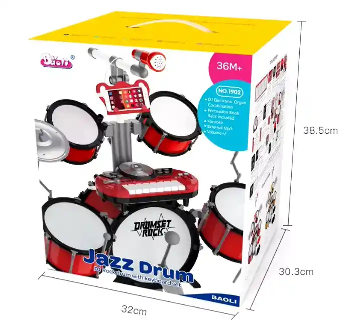 ¡COMPRA SEGURO, SERIEDAD Y COMPROMISO!, Somos importadores y distribuidores pregunta precios al por mayor de nuestros productos. "Se necesita más amor de gente buena" Valor educativo: Este DJ Rock Drum con teclado con micrófono Educativo Jazz Drum Set está diseñado para niños de 2 a 7 años, proporcionando una forma atractiva e interactiva de introducirlos en el mundo de la música y el ritmo, promoviendo el desarrollo cognitivo y la creatividad. Instrumento multifuncional: este conjunto de batería viene con un teclado y un micrófono, lo que permite a los niños explorar diferentes estilos y técnicas musicales, incluida la batería de jazz. Personalizable: Puede personalizar su logotipo en el producto, lo que lo convierte en un regalo único para su hijo o una ocasión especial. Duradero y portátil: hecho de plástico y metal de alta calidad, este conjunto de batería es duradero y fácil de transportar, con un diseño compacto que encaja perfectamente en un cartón de 32x30,3x38,5 cm. Perfecto para jóvenes músicos: Si usted es un padre o un maestro, este conjunto de batería de jazz educativo es una excelente opción para los niños que están empezando a aprender música, con 8 escalas y un método de juego de tipo clave que hace que sea fácil de aprender y jugar a lo largo. Características: - Hecho de material ABS duradero, seguro y no tóxico - Ayuda a desarrollar el sentido del ritmo de los niños, la apreciación por la música y la coordinación mano-ojo - Juguete compuesto por una batería con un teclado electrónico desmontable y un micrófono - El piano incluye 4 efectos de sonido de DJ y 3 efectos de sonido de guitarra eléctrica, se reproduce un efecto de sonido cada vez - Incluye conexión que permiten conectarse a tu teléfono móvil, reproductor mp3 u ordenador - Para el funcionamiento del teclado se requieren 3 pilas AA que no están incluidas - Apta para niños a partir de 3 años Especificaciones: - Color: rojo - Material: ABS - Medidas totales: 77,5x40x76,5 cm (LxANxAL) - Medidas del taburete: Ø24x21 cm (DiámxAL) - Carga máxima: 50 kg (taburete) - Batería: se requieren 3 pilas AA (no incluidas) - Certificaciones: EN71-123 y EN62115 - Referencia: 390-022