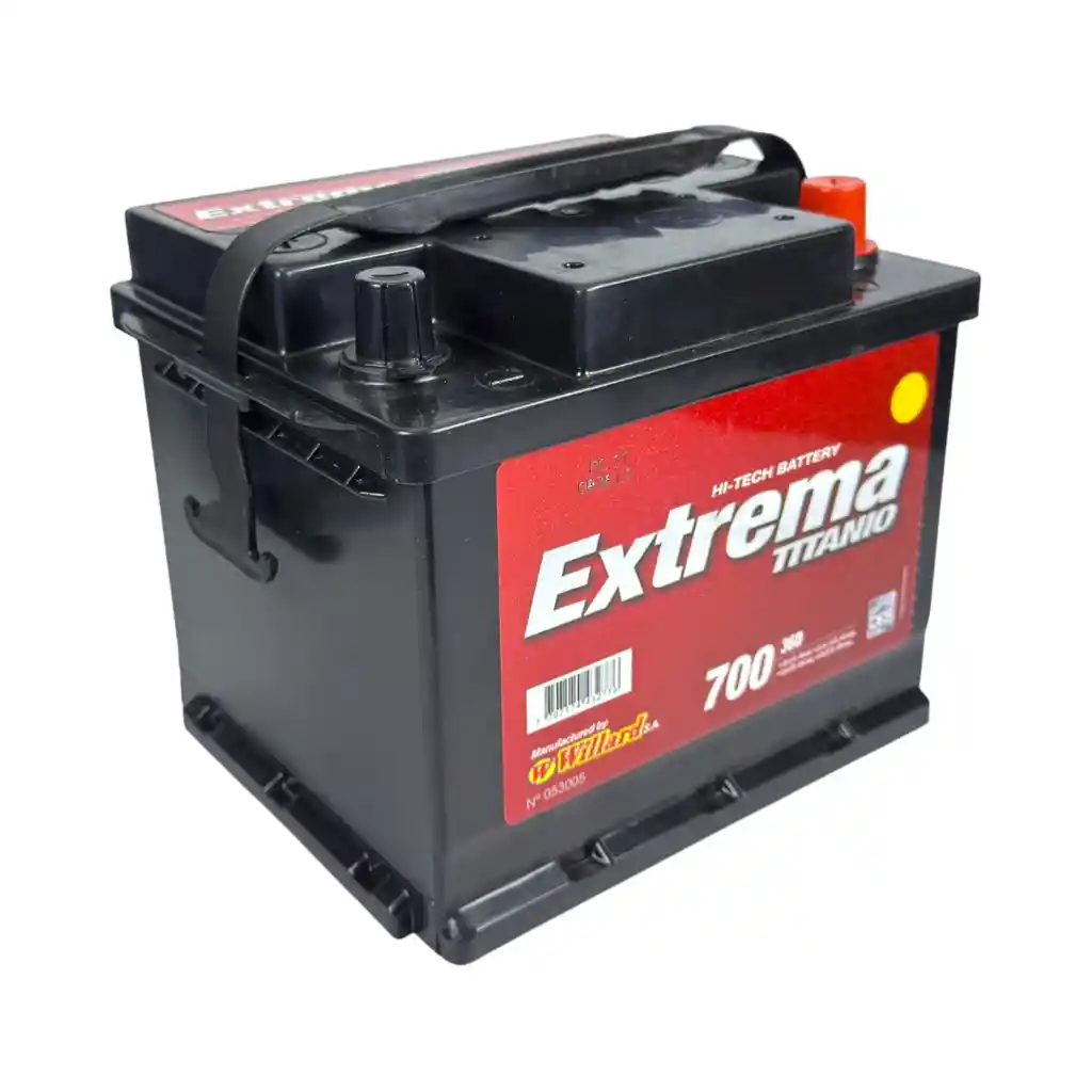 Batería automotriz EXTREMA TITANIO de 12V con 750 amperios. Línea reforzada para trabajo exigente. Proporciona potencia estable y desempeño confiable en el uso diario.